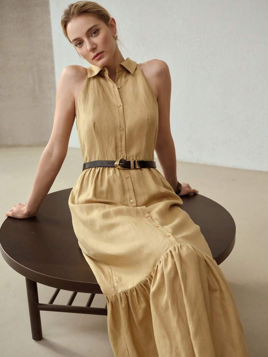MOTF PREMIUM Vestido De Linho Puro Com Cinto De Flor Metálica Dourada