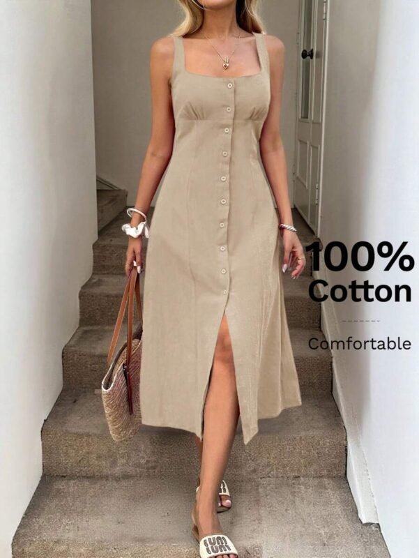 Easowa Vestido Midi de Linho Elegante para Férias e Verão, Decote Quadrado, Busto Franzido, Abertura na Frente, Laço nas Costas, Cintura com Laço, Estilo A-Line, Sem Mangas, Casual, Vestido de Linho Boho Maxi para Mulheres, Vestido Longo para Praia e Féri