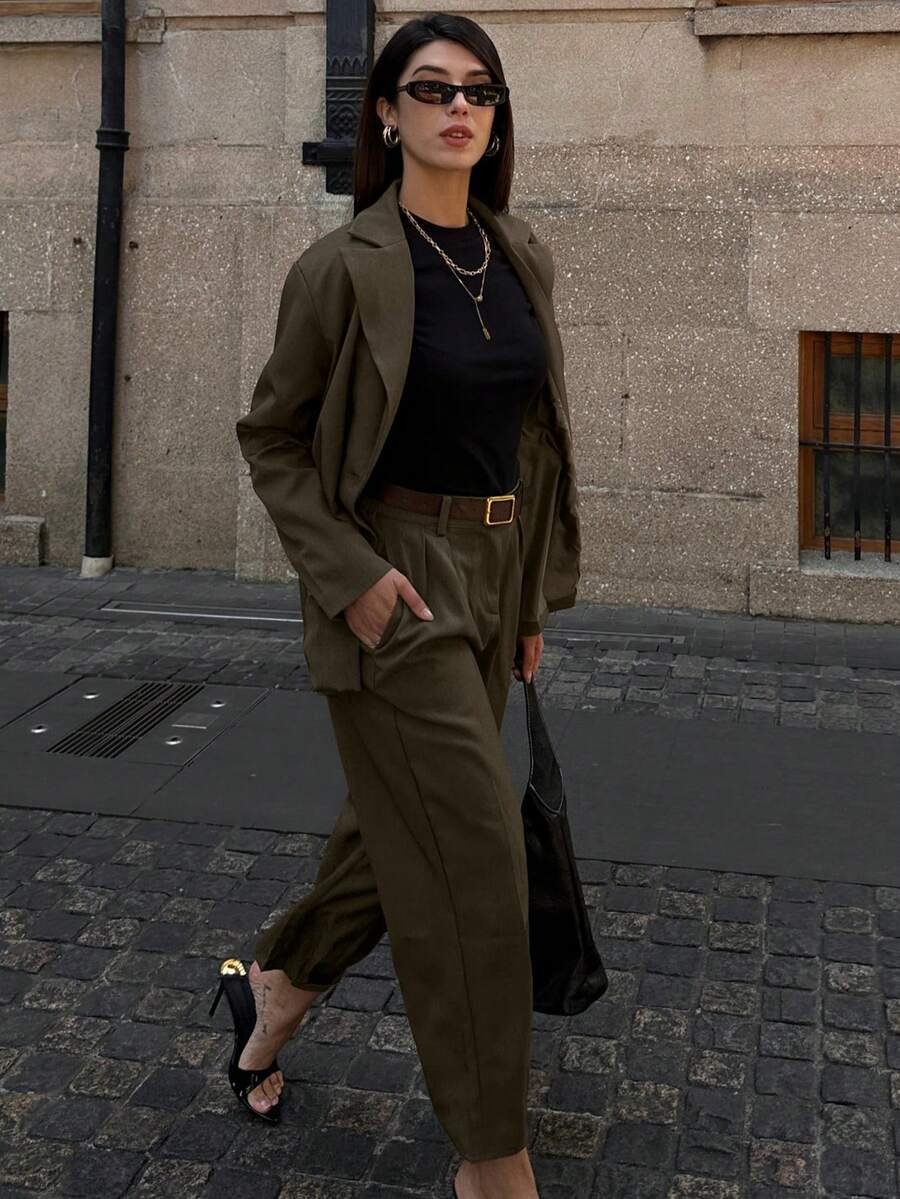 Conjunto Feminino de Alfaiataria Social com Blazer Alongado de Manga Longa e Calça Pantalona Forrada – MOS Mariana Olympio